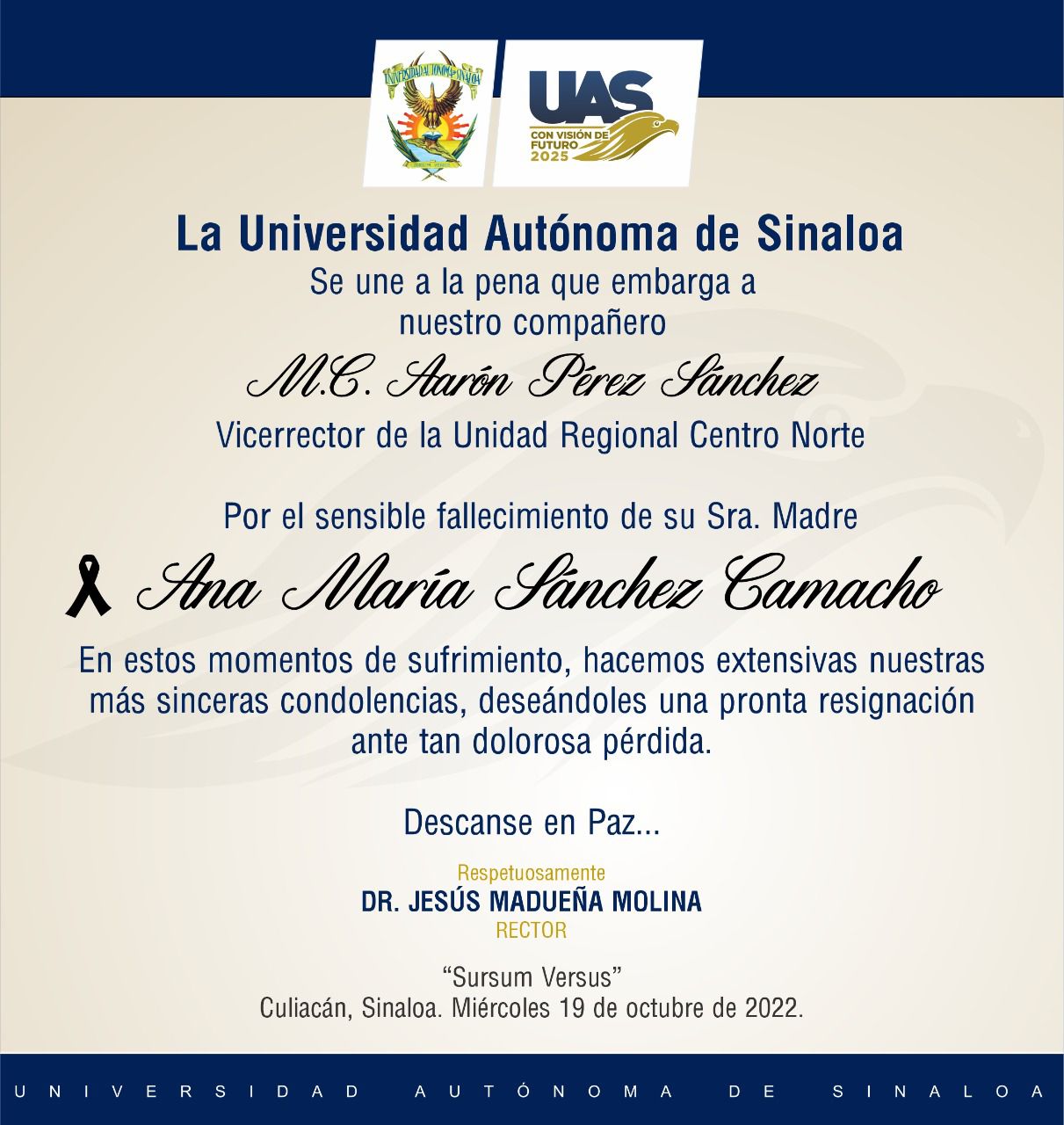 La universidad Autónoma de Sinaloa, participa con profunda pena  el sensible fallecimiento  de la Sra.