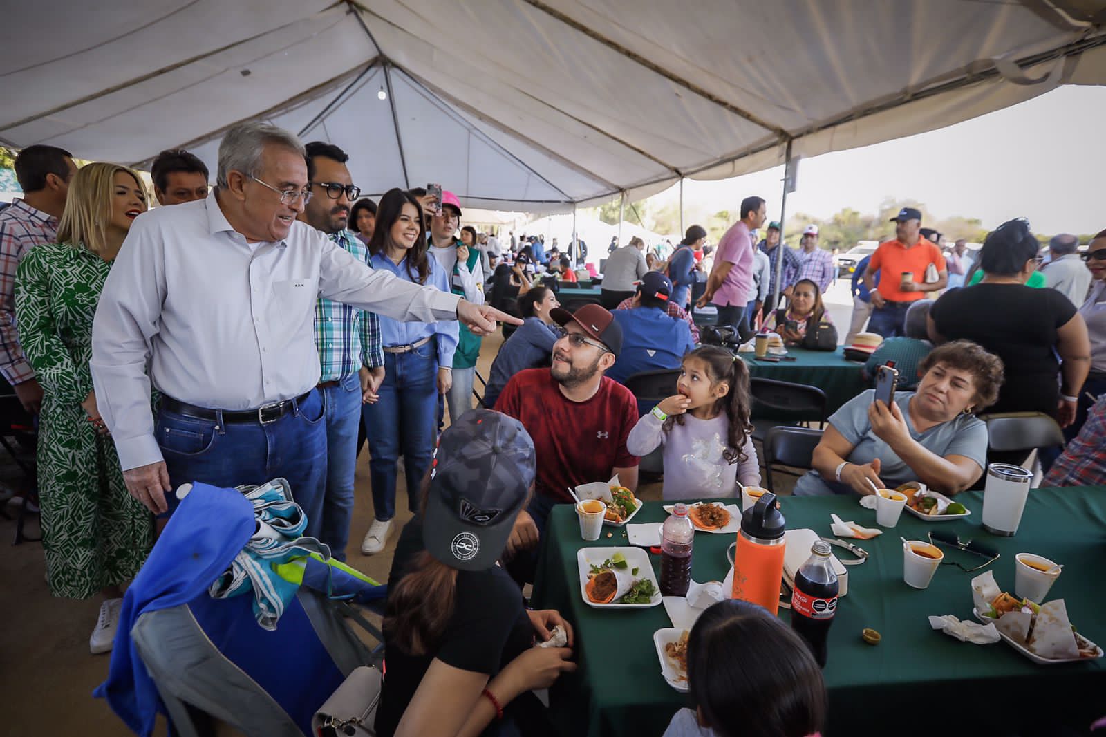 El gobernador Rubén Rocha Moya departió con los cientos de familias que acudieron al primer día del Festival del Globo, que sábado y domingo tendrá lugar en el vaso de la presa de Sanalona, lugar conocido popularmente como Narnia, debido a su belleza natural.
