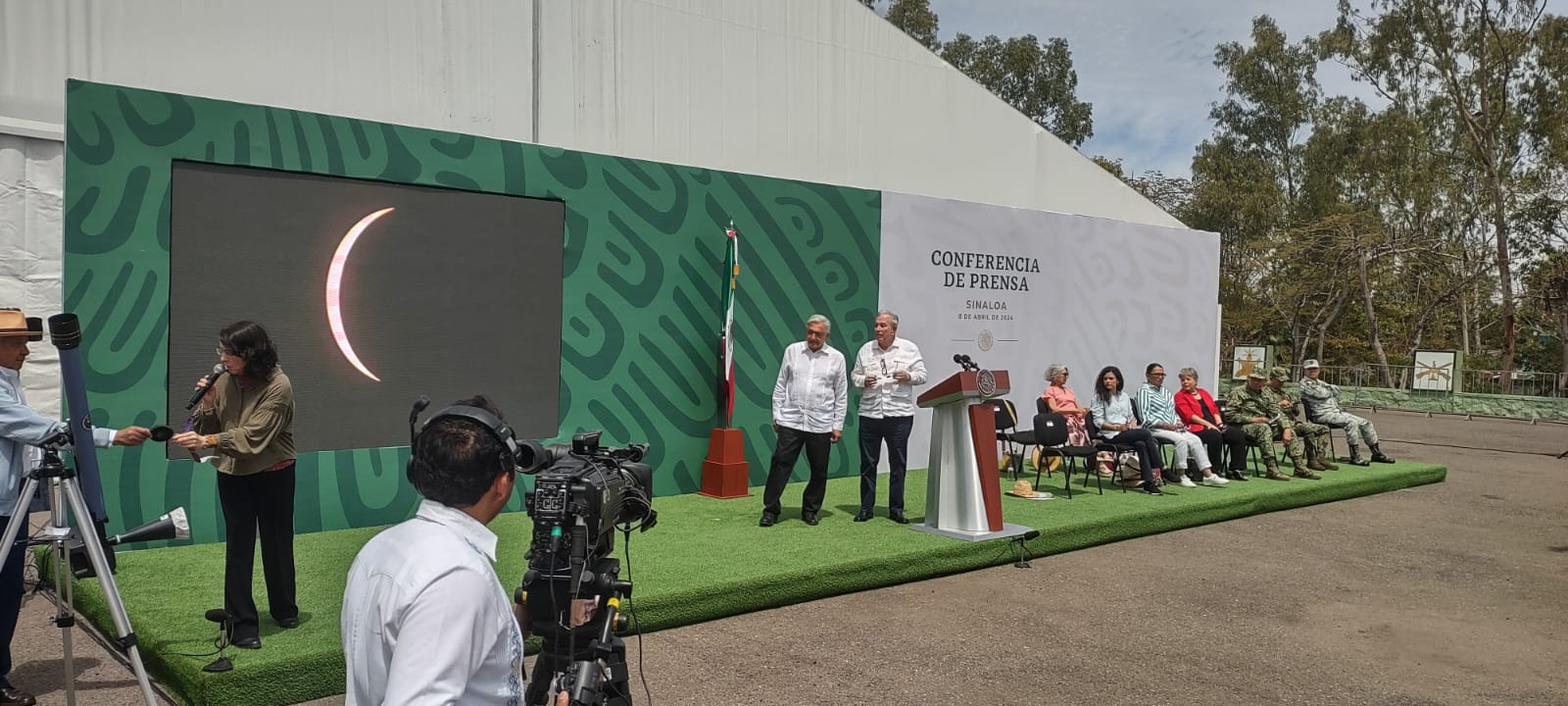 El presidente de la República, Andrés Manuel López Obrador presenció junto con el gobernador Rubén Rocha Moya el eclipse total de sol, desde las instalaciones de la Tercera Región Militar, lugar donde se desarrolla la conferencia de prensa matutina del presidente de la Nación.