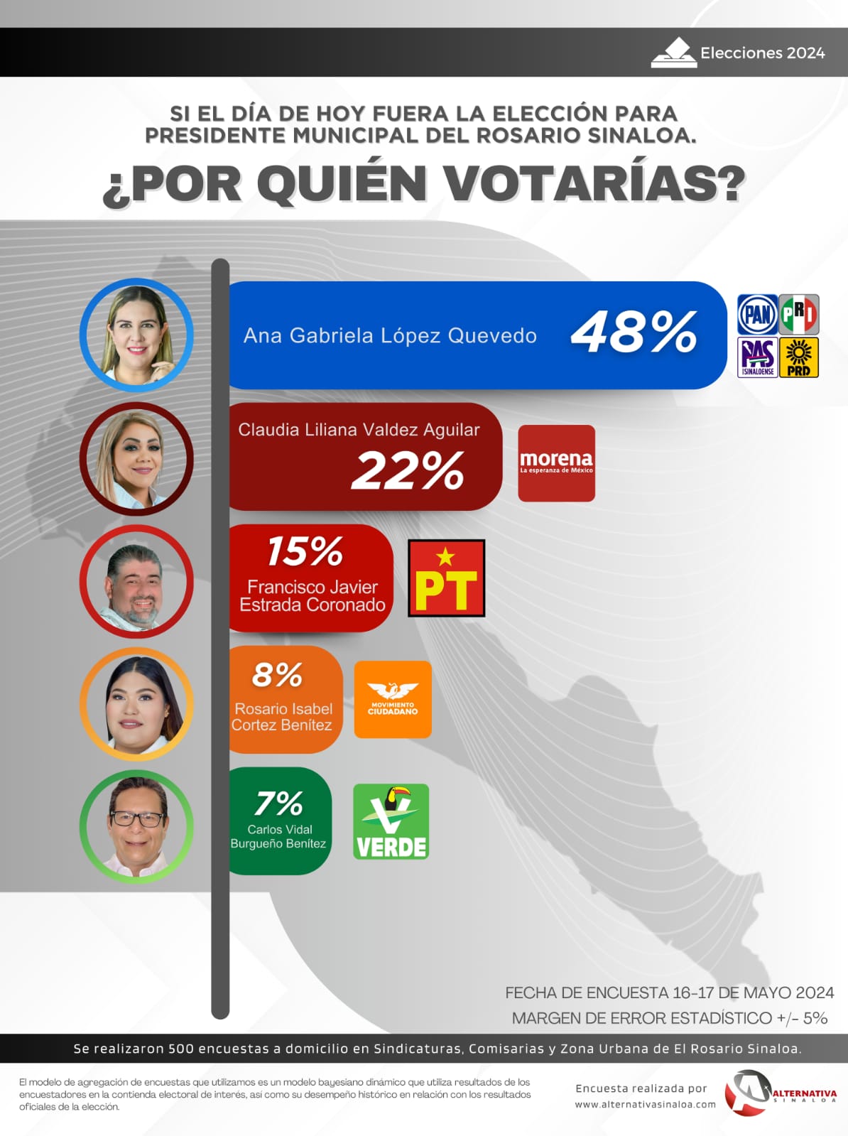 Asi lo demuestra la ultima encuesta que realizamos en aproximadamente 500 hogares de sindicaturas, comisarias y en la zona urbana de el municipio, dicha encuesta tiene un margen de error estadistico de +/- 5%; la encuesta fue realizada los dias 16 y 17 de mayo de 2024.