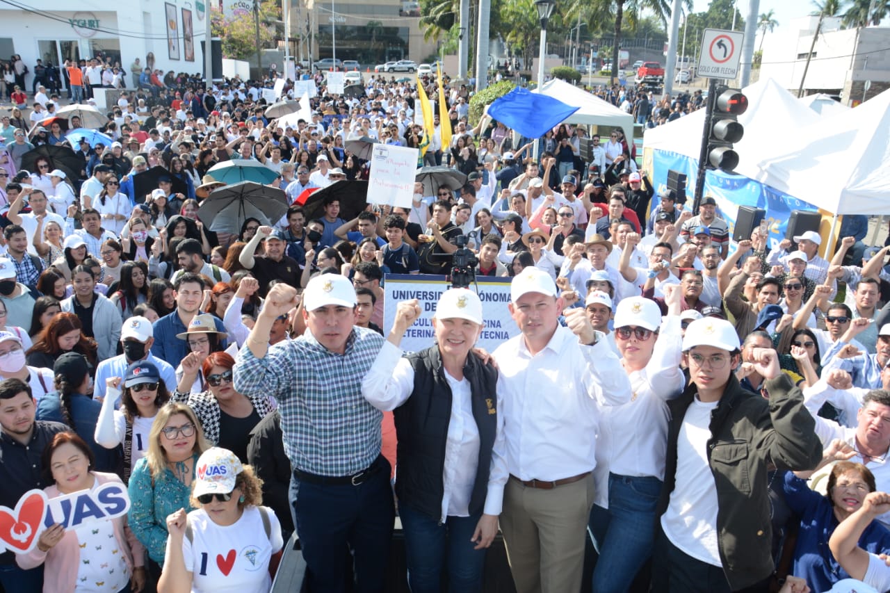“Saldremos airosos y ganaremos esta lucha, no es posible que se pueda trabajar con un gobierno que usa la política del miedo y del terror, que usa las mentiras, las calumnias, y las difamaciones; aquí está el sector que piensa, que pondrá un alto a estos abusos, a estos excesos y totalitarismo de un gobierno represor, por eso sigamos en este movimiento (…) digamos como una solo: ¡que viva la UAS!”, manifestó Aceves Tamayo.