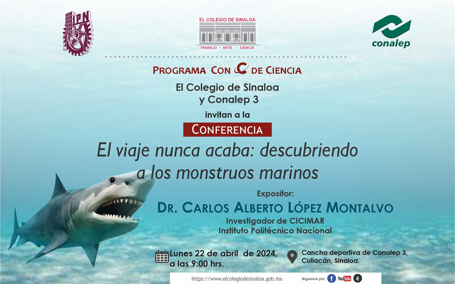 Para continuar con la agenda de actividades del programa académico Con C de Ciencia, auspiciado por El Colegio de Sinaloa, el doctor Carlos Alberto López Montalvo —investigador del Centro Interdisciplinario de Ciencias Marinas, CICIMAR-IPN— disertará la conferencia: El viaje nunca acaba: descubriendo a los monstruos marinos, el próximo lunes 22 de abril del año en curso, a las 9:00 hrs., ante estudiantes del CONALEP 3 de Culiacán.