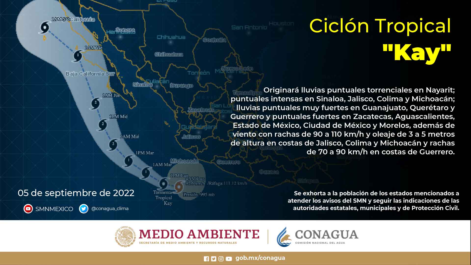 Vale la pena compartir esta noticia Se suspenden Clases en todo Sinaloa, ante el pronostico de lluvias torrenciales a consecuencia de la tormenta tropical Kay. Para la Ciudad de México y el Estado de México se pronostican lluvias fuertes. Se estiman vientos con rachas de 90 a 110 km/h y oleaje de 3 a 5 …