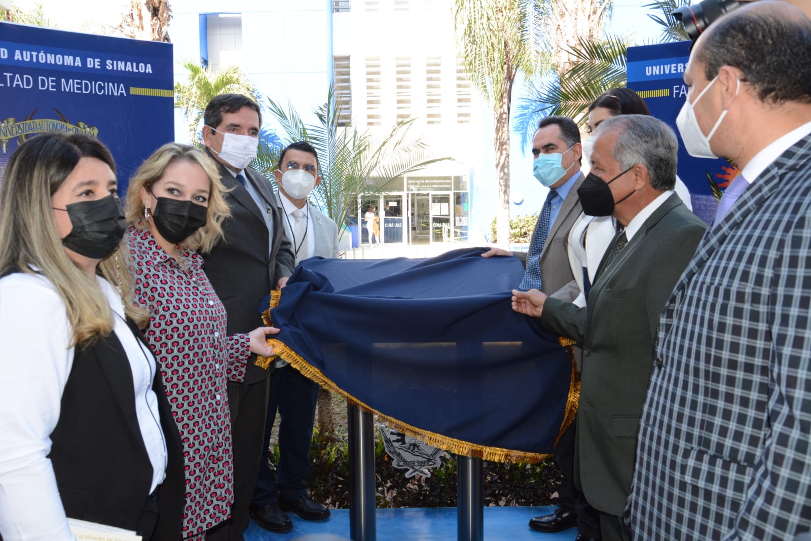 En el jardín de la explanada se develó una placa alusiva al 45 aniversario de la Facultad de Medicina con la cual se rinde un homenaje a sus estudiantes, docentes y médicos egresados que entregaron su tiempo, esfuerzo, conocimiento y algunos la vida misma en la lucha contra el COVID-19.