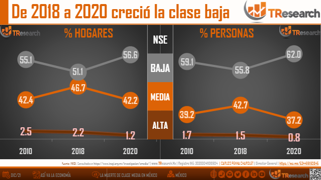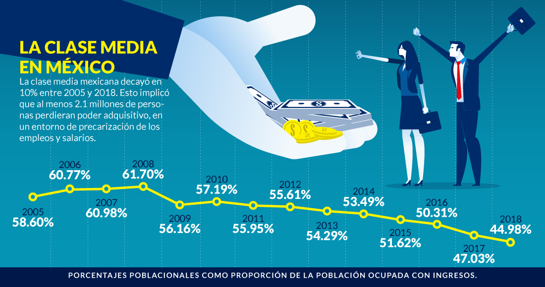 Considerando los hogares mexicanos la situación no es distinta, donde en 2018 había 47 por ciento de hogares de clase media y para el cierre de 2020 existían 42 por ciento, cinco puntos porcentuales menos.