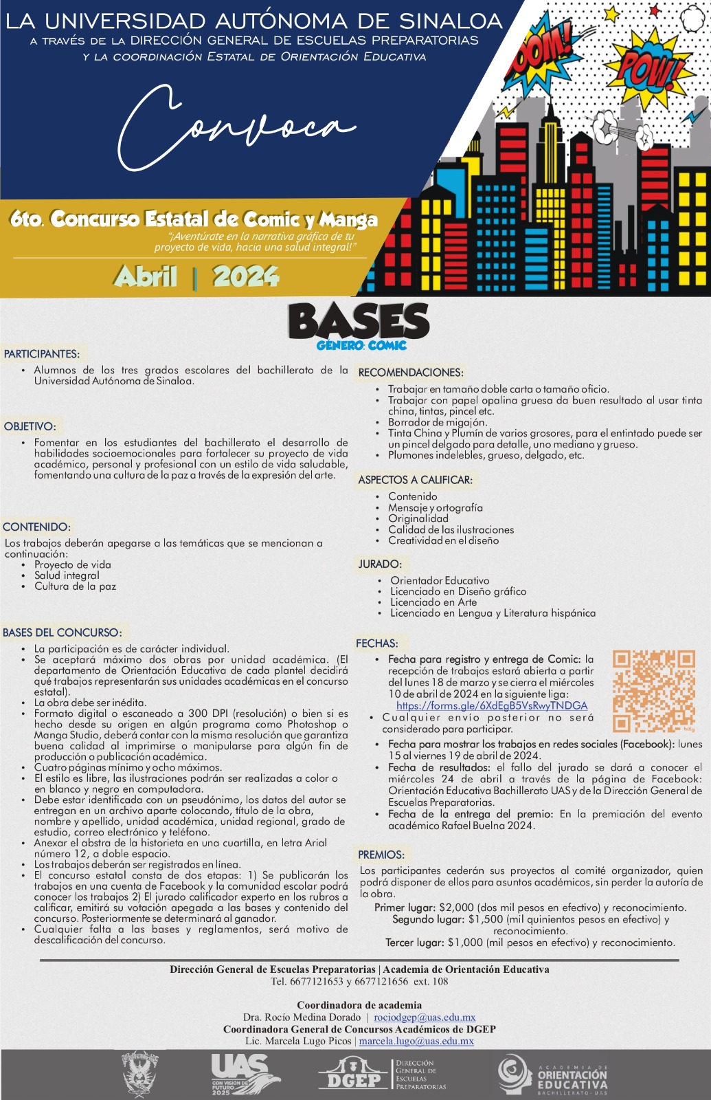 La Dirección General de Escuelas Preparatorias (DGEP) de la Universidad Autónoma de Sinaloa (UAS) hasta el 10 de abril mantendrá abierta la convocatoria para el 6to Concurso Estatal de Comic y Manga, el cual ya se está haciendo una gran tradición dentro de los estudiantes y cada vez son más los trabajos que se presentan, informó Rocío Medina Dorado, coordinadora estatal de Orientación Educativa.“El objetivo fundamental del sexto Concurso Estatal de Comic y Manga: Aventúrate en la narrativa gráfica de tu proyecto de vida hacia una salud digna, es fomentar en los estudiantes del bachillerato el desarrollo de habilidades socioemocionales y a través de este desarrollo poder fomentar en ellos la construcción de un proyecto de vida, la salud integral y el tema de la cultura de la paz”, detalló.