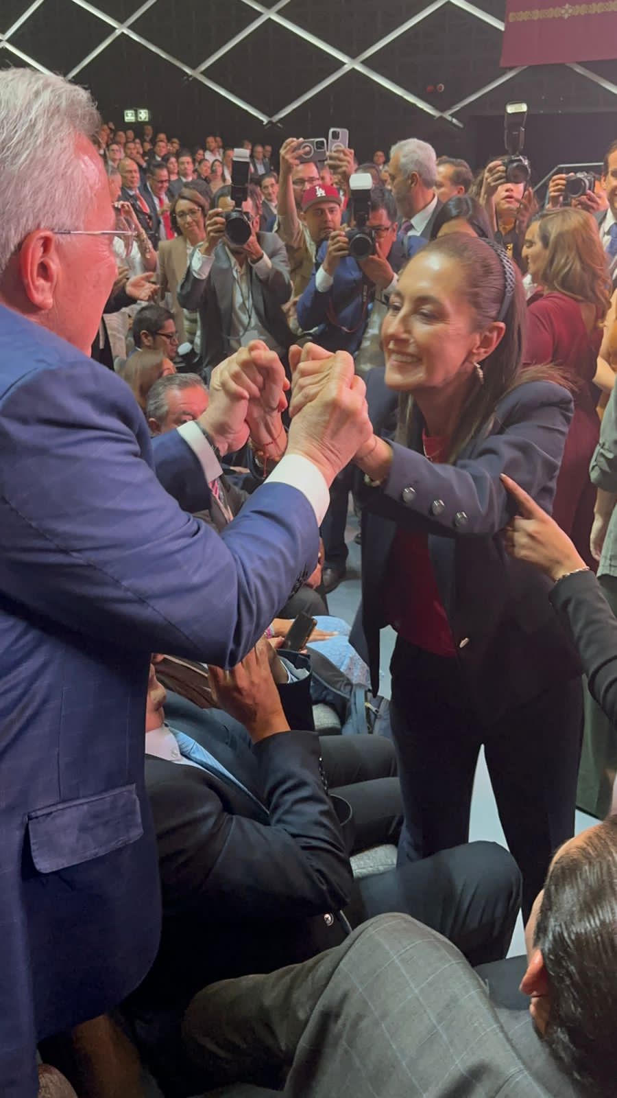 El gobernador Rubén Rocha saluda a la Doctora Claudia Sheinbaum Pardo, recién electa Coordinadora de los Comités de Defensa de la Cuarta Transformación, durante la ceremonia donde rindió protesta Delfina Gómez Álvarez como gobernadora del Estado de México.