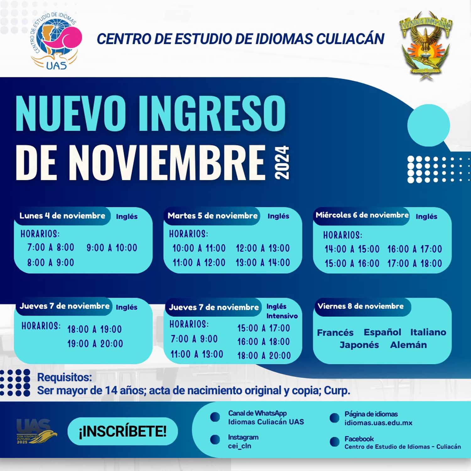 “A todas las personas que les interese aprender una segunda o una tercera lengua, a partir del 4 de noviembre, la Universidad Autónoma de Sinaloa esta inscribiendo en todos sus Centros de Idiomas. Busca el Centro de Idiomas más cercano a tu localidad e inscríbete, es el momento de aprender una segunda lengua”, expresó.