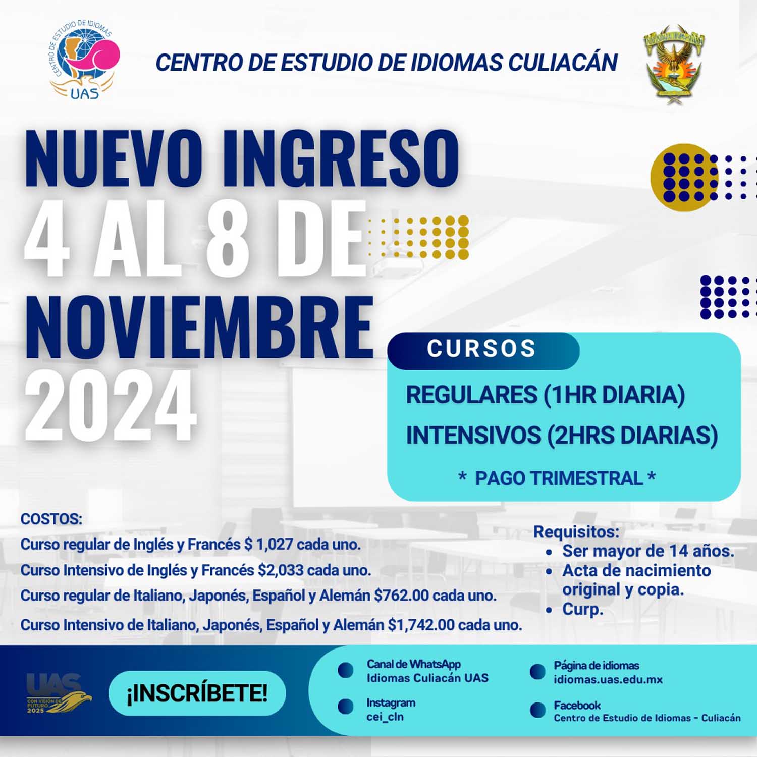 Del 4 al 8 de noviembre, el Centro de Estudio de Idiomas (CEI) Culiacán de la Universidad Autónoma de Sinaloa (UAS) abrirá inscripciones para cursos regulares, intensivos y sabatinos de inglés, francés, alemán, español, italiano y japonés, en todos los horarios.