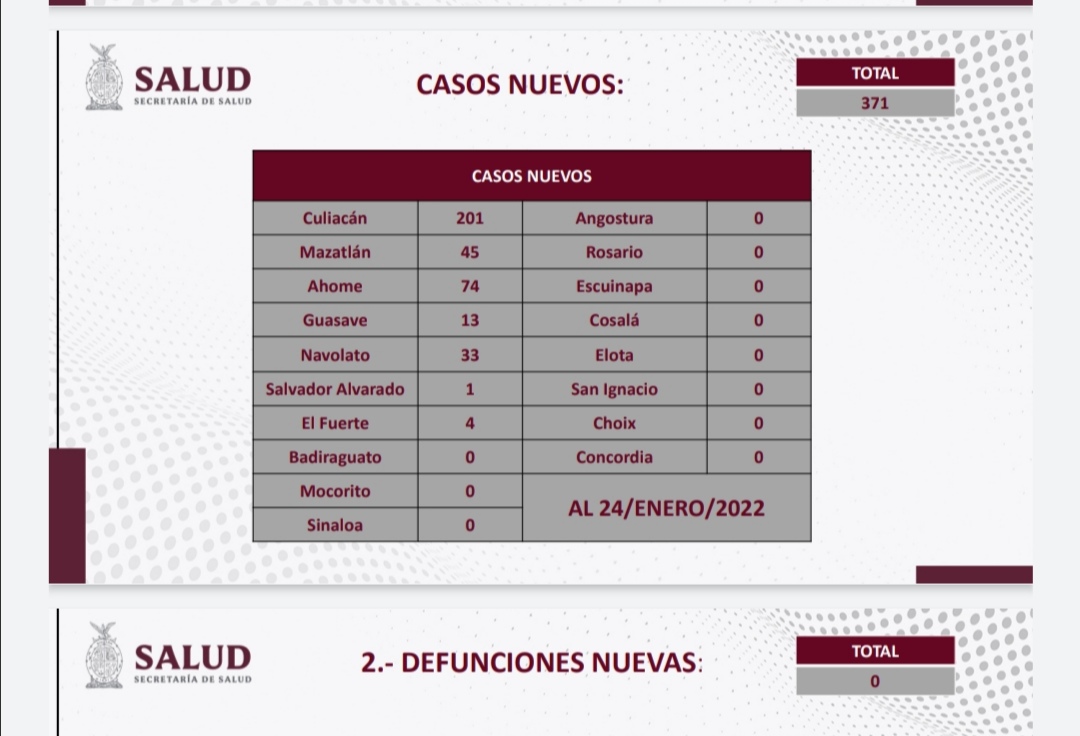 de acuerdo al reporte de la Secretaría de Salud, solo 371 casos se reportaron este lunes, de los cuales; 201 pertenecen a Culiacán, 45 Mazatlán, 74 Ahome, 13 Guasave, 33 Navolato, 1 Salvador Alvarado y 4 El Fuerte.