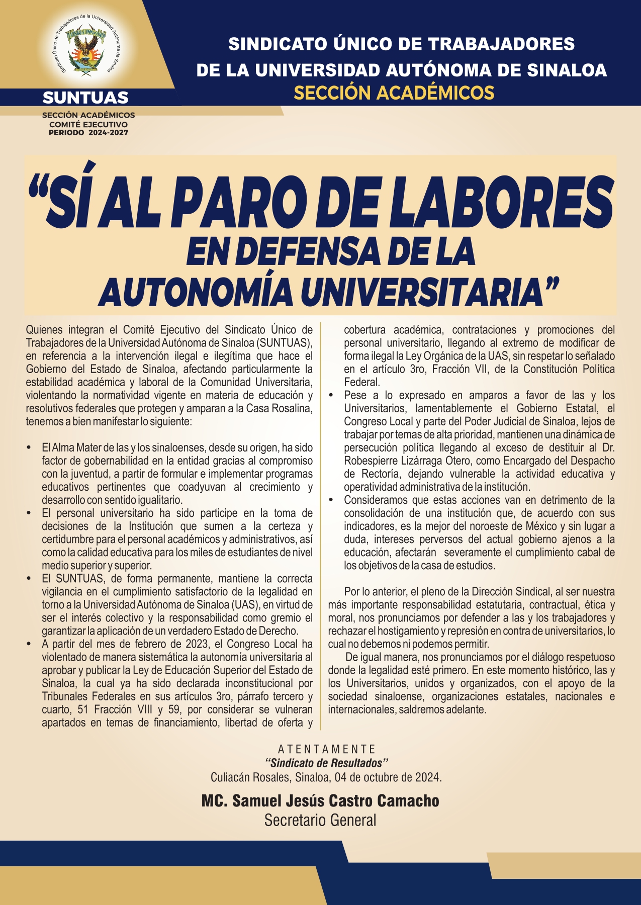 En un documento firmado por su secretario general, el maestro en ciencias Samuel Jesús Castro Camacho, el Sindicato Único de Trabajadores de la Universidad Autónoma de Sinaloa (SUNTUAS) sección Académicos, dijo sí al paro de labores en defensa de la autonomía universitaria al cual llamó para el próximo 7 de octubre el Encargado del Despacho de Rectoría, el doctor Candelario Ortiz Bueno.
