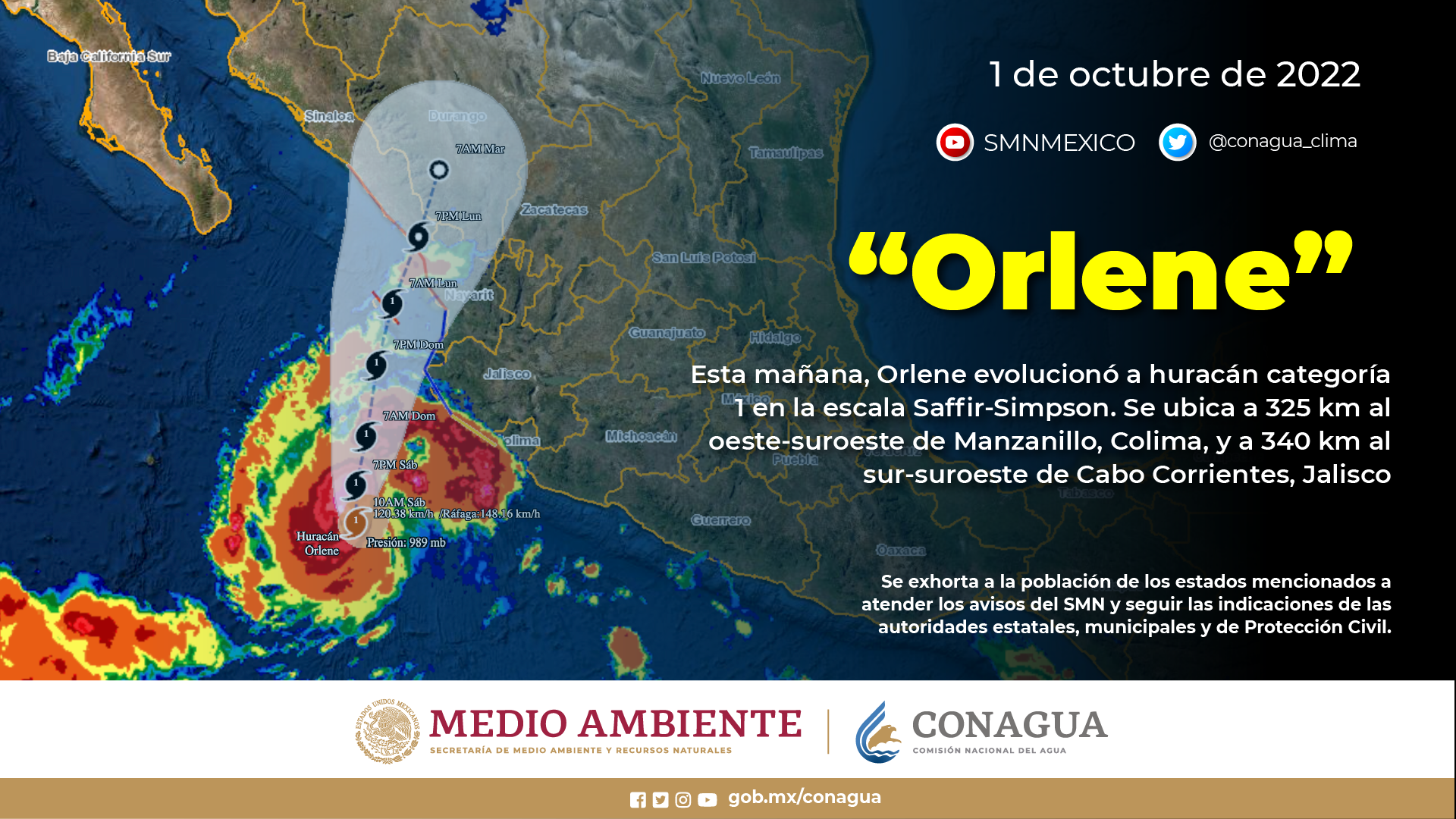 En el transcurso de la noche, el huracán Orlene de categoría 2 en la escala SaffirSimpson, continuará su desplazamiento frente a las costas de Jalisco, su amplia circulación producirá lluvias puntuales intensas (de 75 a 150 milímetros [mm]) en áreas de Colima y Jalisco; muy fuertes (de 50 a 75 mm) en zonas de Michoacán, Nayarit y Sinaloa, y fuertes (de 50 a 75 mm) en sitios de Durango; además se pronostican rachas de viento de 60 a 70 kilómetros por hora (km/h) y oleaje de 2 a 4 metros (m) de altura en las costas de Jalisco y Nayarit, y de 40 a 50 km/h con olas de 1 a 2 m de altura en el litoral de Colima y Sinaloa.