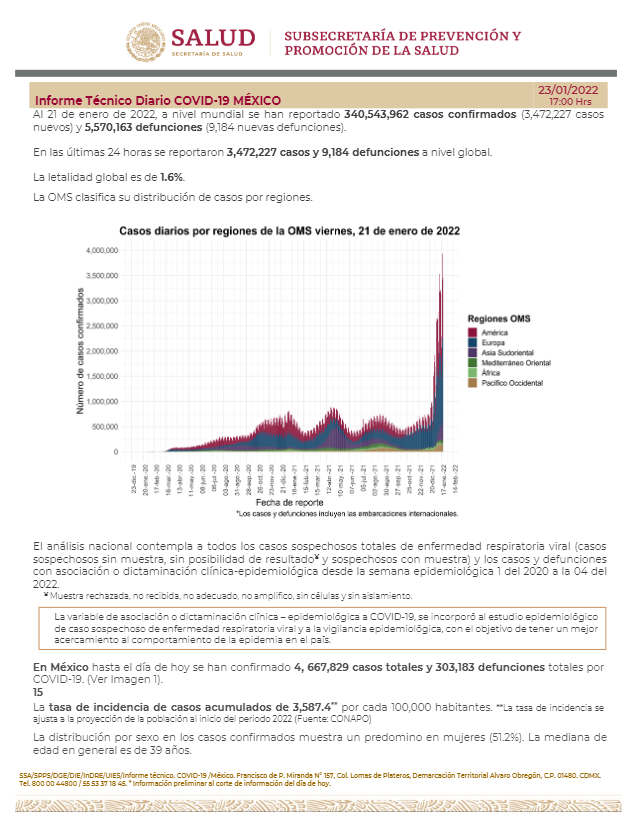 La Secretaría de Salud informó este domingo que México suma 4 millones 667 mil 829 casos y 303 mil 183 muertes por COVID-19.