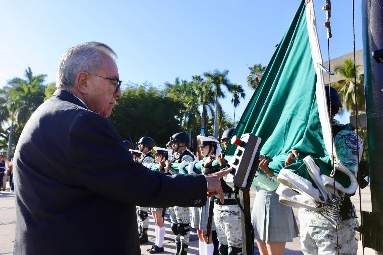 La ceremonia tuvo lugar en la explanada de Palacio de Gobierno, el gobernador Rocha izó la bandera nacional a toda asta y montó guardia de honor ante el monumento al general Lázaro Cárdenas.