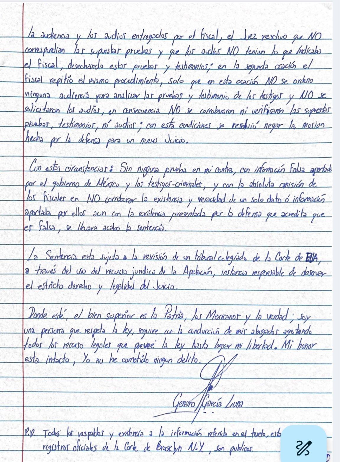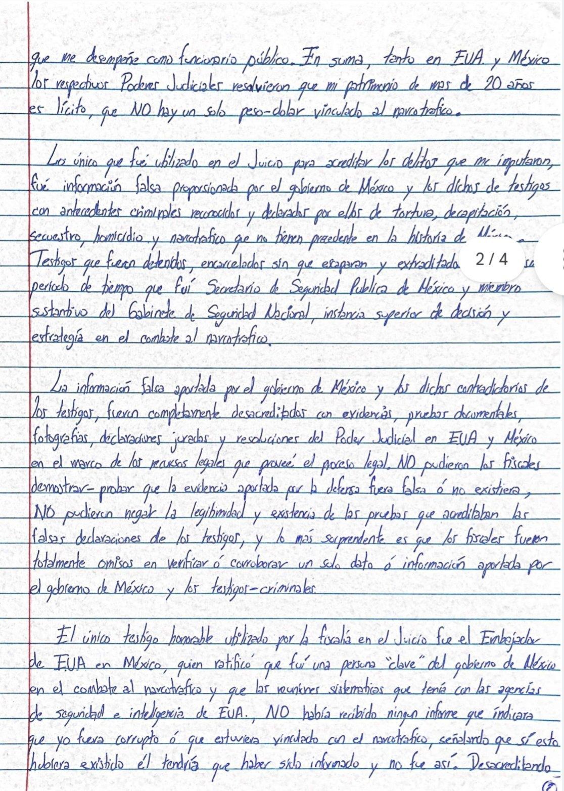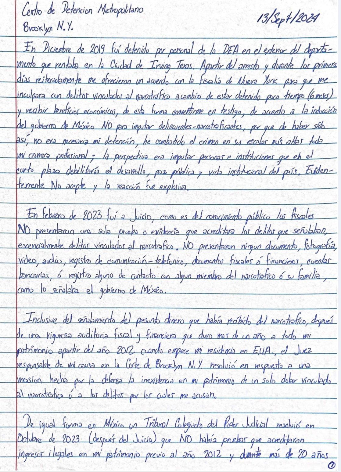 Mediante una carta escrita a mano y dada a conocer por el periodista Arturo Ángel, el exsecretario de Seguridad Pública federal señaló que los narcotraficantes que testificaron en su contra durante su juicio en Estados Unidos también imputaron al presidente López Obrador “y a sus operadores” de tener vínculos con ellos.