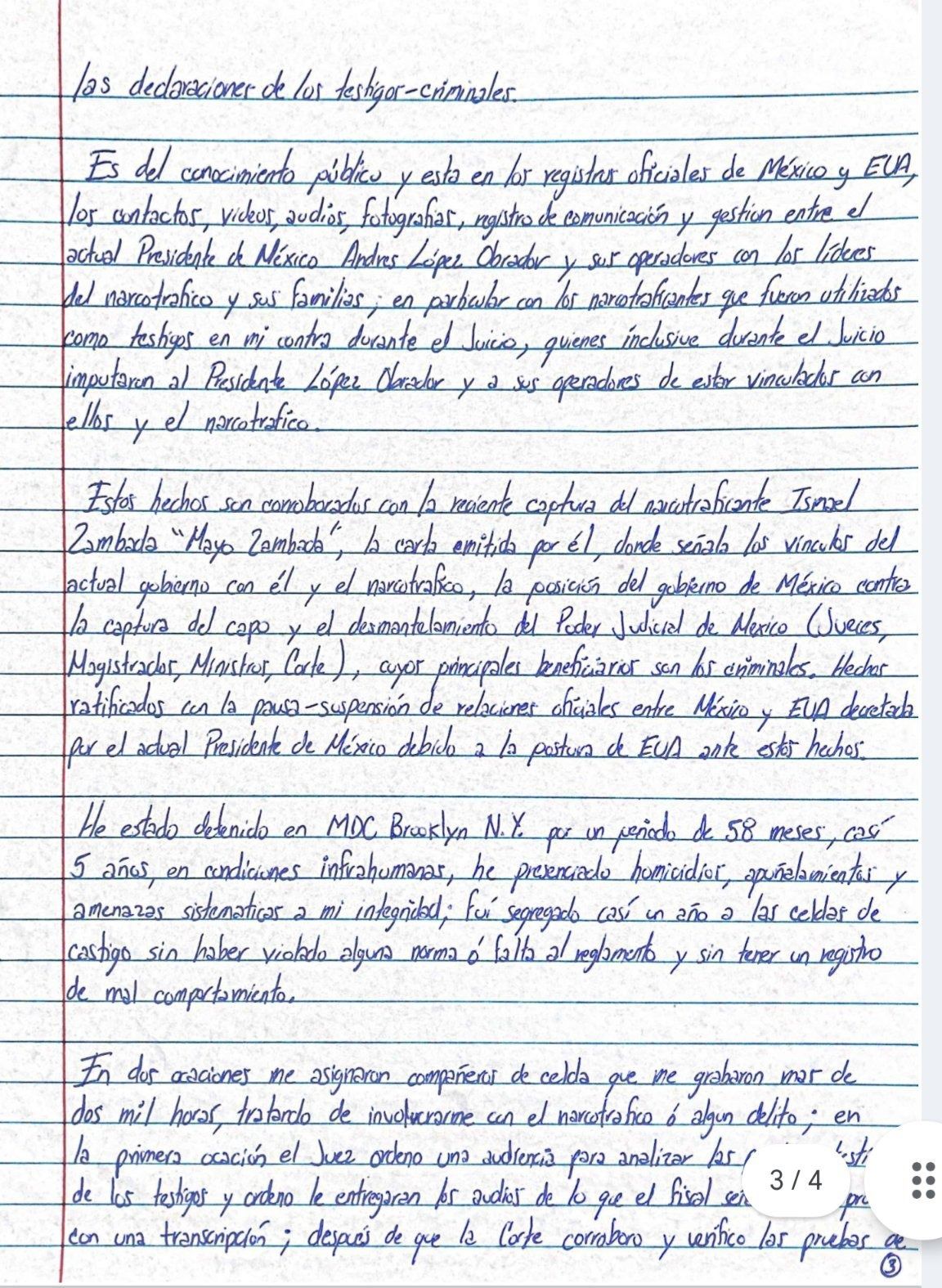 Estos hechos son corroborados con la reciente captura del narcotraficante Ismael Zambada, ‘Mayo Zambada’. La carta emitida por él donde señala los vínculos del actual Gobierno con él y el narcotráfico, la posición del Gobierno de México contra la captura del capo y el desmantelamiento del Poder Judicial de México, cuyos principales beneficiarios son los criminales”, expuso.