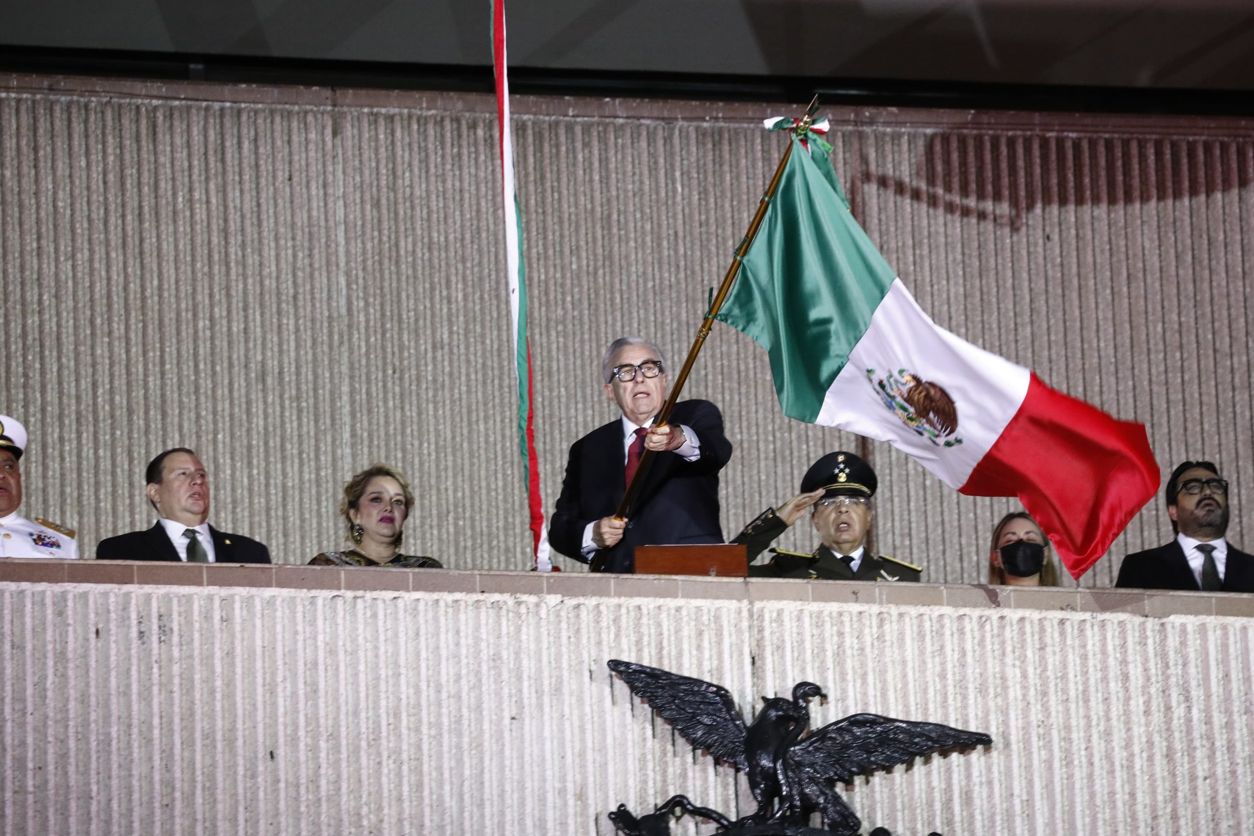En un solemne acto protocolario, el gobernador Rubén Rocha Moya conmemoró el 215 aniversario del Grito de Independencia, y como cada año, desde el balcón principal de Palacio de Gobierno, ondeó en su diestra la bandera nacional para recordar y vitorear a los héroes que nos dieron patria y libertad, para enseguida repicar la gigantesca campana que luce en el balcón.