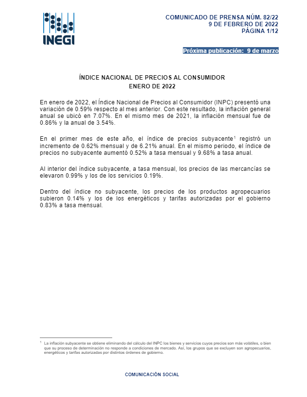El Índice Nacional de Precios al Consumidor #INPC presentó en enero de 2022 una variación de 0.59% respecto al mes inmediato anterior. La inflación anual se ubicó en 7.07%. En mismo mes de 2021, la inflación mensual fue de 0.86% y la anual de 3.54%. https://t.co/c3rhpy2I5K #INEGI pic.twitter.com/b4pEKpTuly