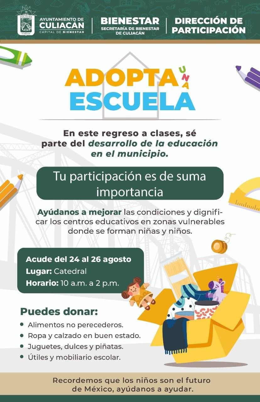 Por lo anterior, Guerra García, titular de la dependencia, explicó que esta campaña llamada “Adopta Una Escuela”, cuenta con el apoyo y coordinación de la Dirección de Participación, donde se estará realizando una colecta de alimentos no perecederos, útiles escolares, ropa y calzado en buen estado, así como juguetes y mobiliario que pueda ser útil para los espacios escolares, en la Plazuela Álvaro Obregón, a un costado de Catedral, en un horario de 10:00 a.m. a 2:00 p.m.