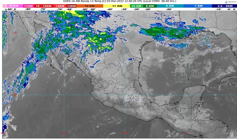 Durante la noche, se prevé la aproximación de un frente frío y una vaguada polar al norte de la Península de Baja California, lo que provocará chubascos, condiciones para la caída de aguanieve o nieve en zonas serranas del norte de Baja California, viento con rachas de 70 a 80 km/h y posibles tolvaneras en el estado y rachas de viento de la misma intensidad en el Mar de Cortés.
