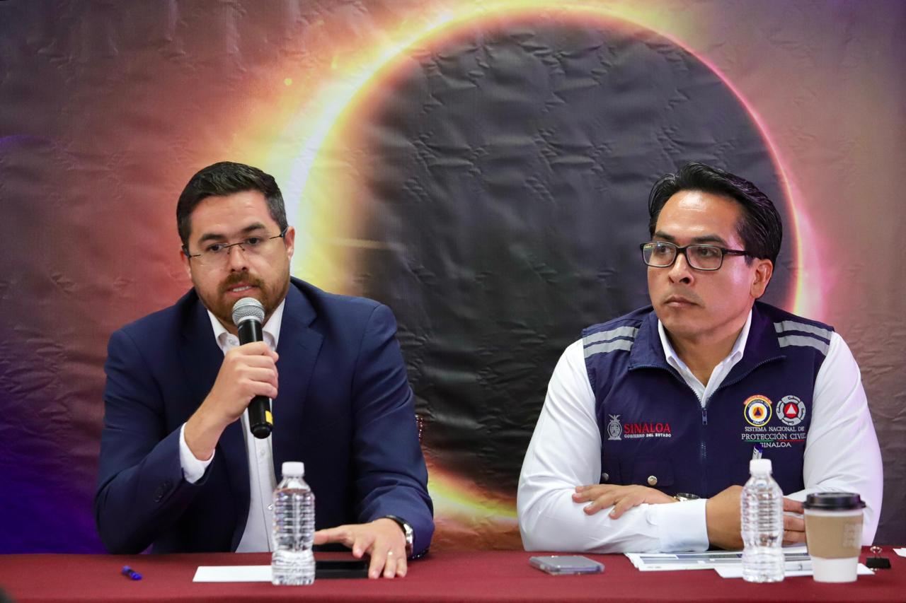 Culiacán, Sinaloa, a 03 de abril de 2024.- En conferencia de prensa conjunta, el secretario de Seguridad Pública, Gerardo Mérida Sánchez y el director del Instituto Estatal de Protección Civil, Roy Navarrete Cuevas, informaron que ya se encuentra listo el operativo de seguridad con motivo del eclipse solar que se producirá este lunes 8 de abril, y para ello se desplegarán 4 mil 900 efectivos de las Policías Municipales y Policía Estatal, así como 1 mil 700 elementos de Protección Civil.