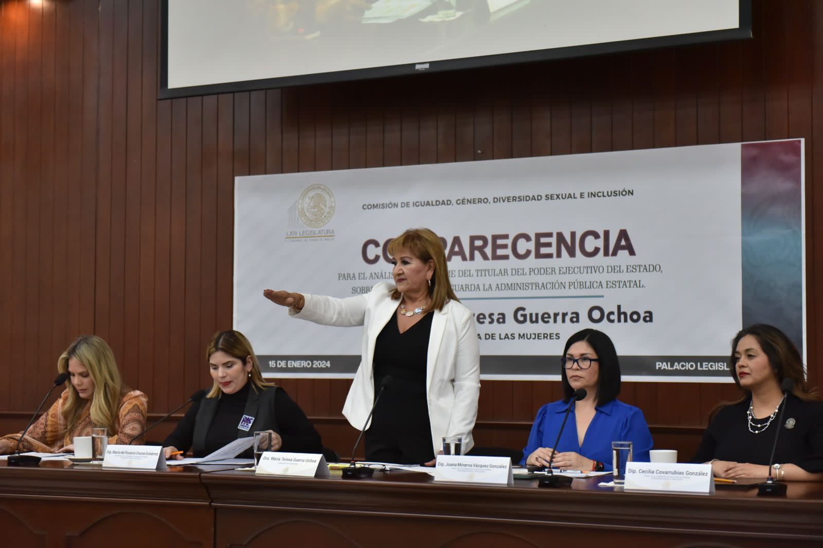 La Dra. María Teresa Guerra Ochoa, Secretaria de las Mujeres, compareció ante las diputadas y diputados del H. Congreso del Estado de Sinaloa para el análisis del Segundo Informe de Gobierno, en el que recalco que el Gobierno del Estado de Sinaloa que encabeza el Dr. Rubén Rocha Moya, sigue dos líneas estratégicas fundamentales que guían el quehacer público en los temas de Género y Derechos Humanos y son: Garantizar que las mujeres de Sinaloa vivan libres de violencia implementando acciones para prevenirla, atenderla, sancionarla y erradicarla así como fortalecer la igualdad, inclusión y transversalidad, eliminando la discriminación y las brechas de desigualdad entre hombres y mujeres.
