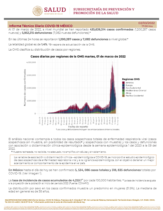 México totaliza 5 millones 534 mil 86 casos y acumula 318 mil 531 decesos en total, informó la Secretaría de Salud.