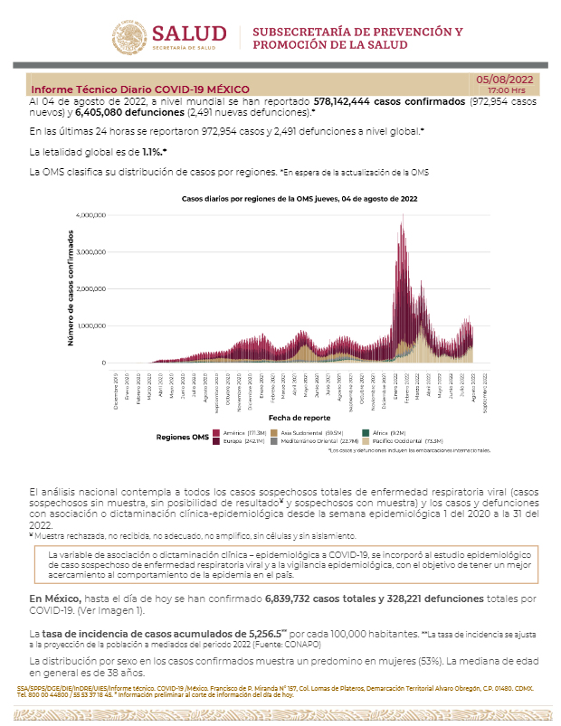 La Secretaría de Salud informó este viernes que México suma 6 millones 839 mil 732 casos y 328 mil 221 muertes por COVID-19.
