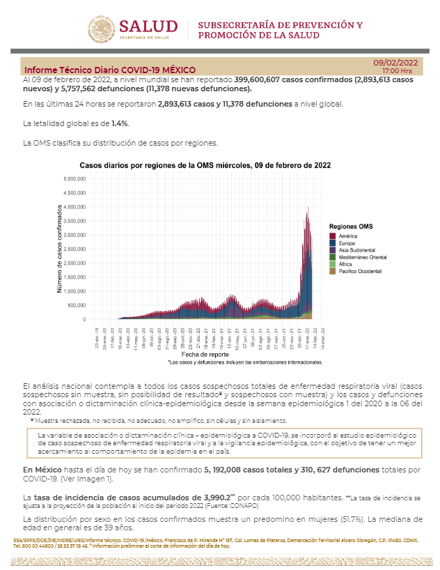 La Secretaría de Salud informó este miércoles que México suma 5 millones 192 mil 8 casos y 310 mil 627 muertes por COVID-19