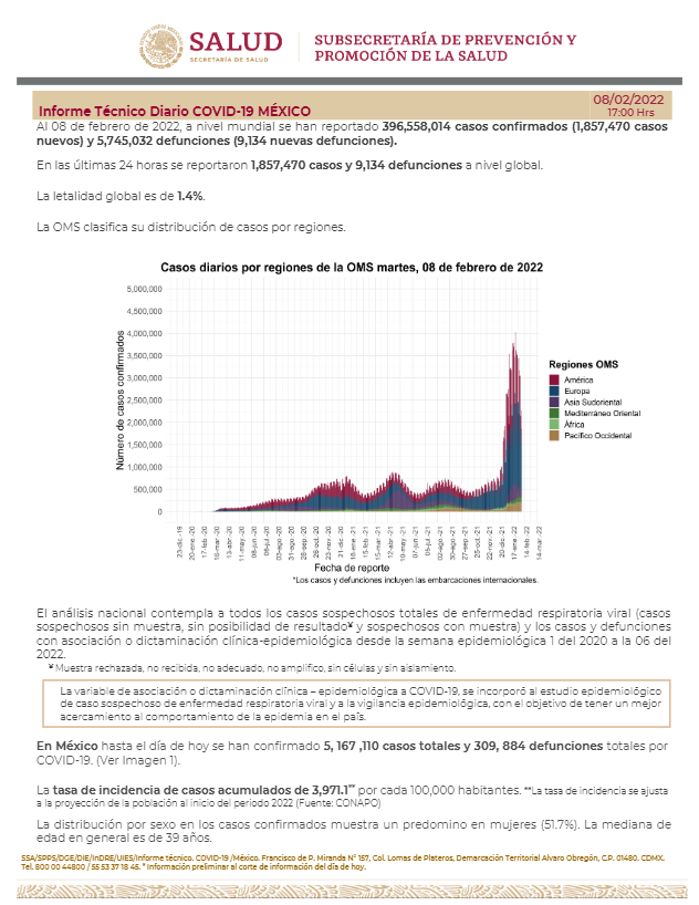 La Secretaría de Salud informó este martes que México suma 5 millones 167 mil 110 casos y 309 mil 884 muertes por COVID-19