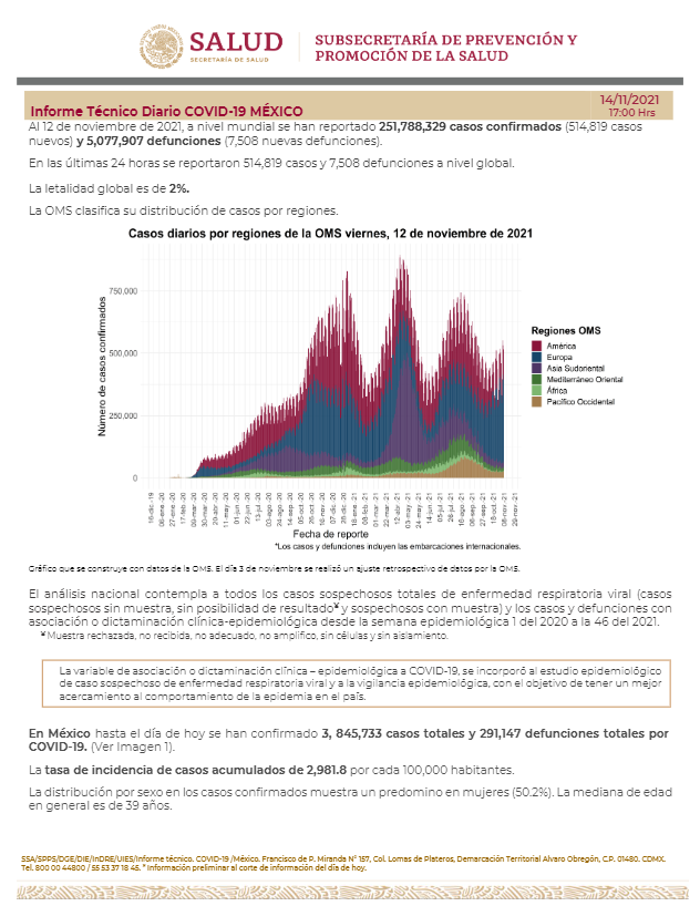 La Secretaría de Salud informó este domingo que México suma 3 millones 845 mil 733 casos y 291 mil 147 muertes por COVID-19