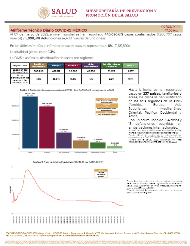 La Secretaría de Salud informó este lunes que México suma 5 millones 566 mil 669 casos y 319 mil 901 muertes por COVID-19