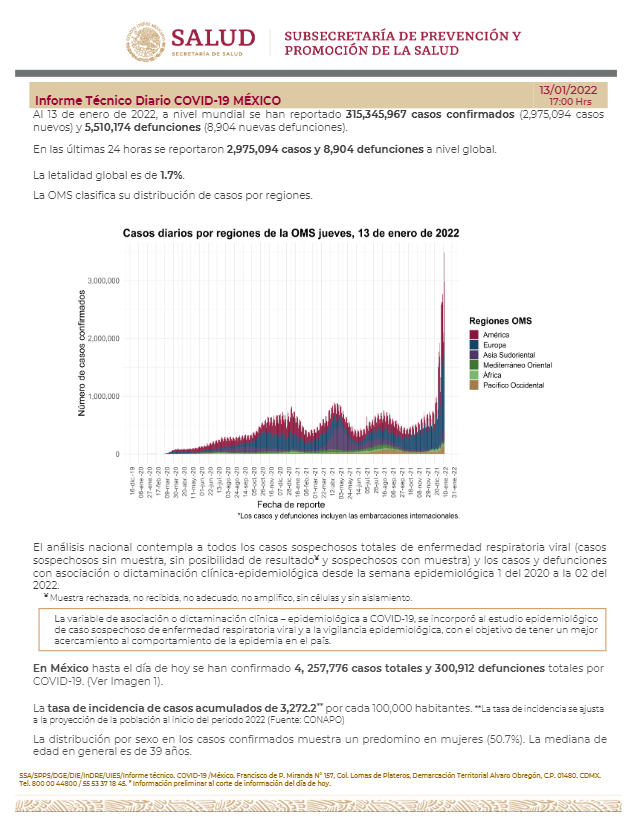 La Secretaría de Salud informó este jueves que México suma 4 millones 257 mil 776 casos y 300 mil 912 muertes por COVID-19