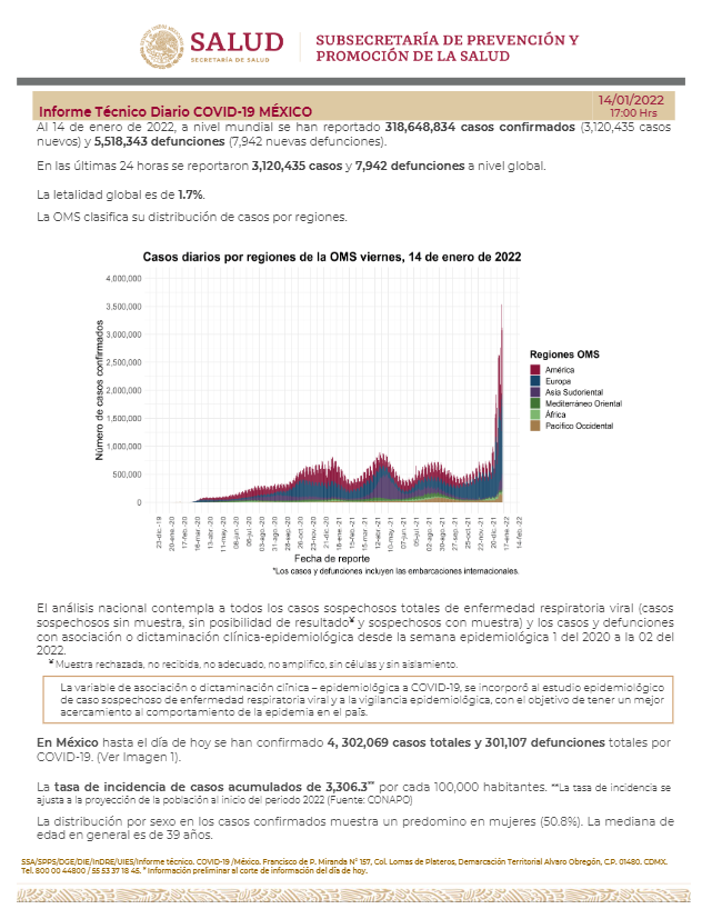 La Secretaría de Salud informó este viernes que México suma 4 millones 302 mil 69 casos y 301 mil 107 muertes por COVID-19