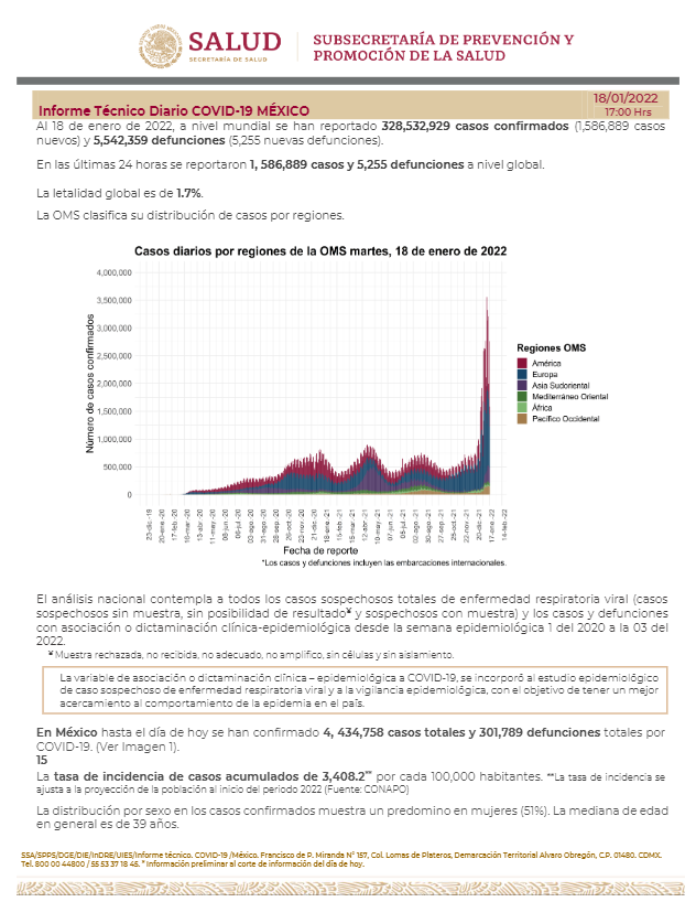 La Secretaría de Salud informó este martes que México suma 4 millones 434 mil 758 casos y 301 mil 789 muertes por COVID-19