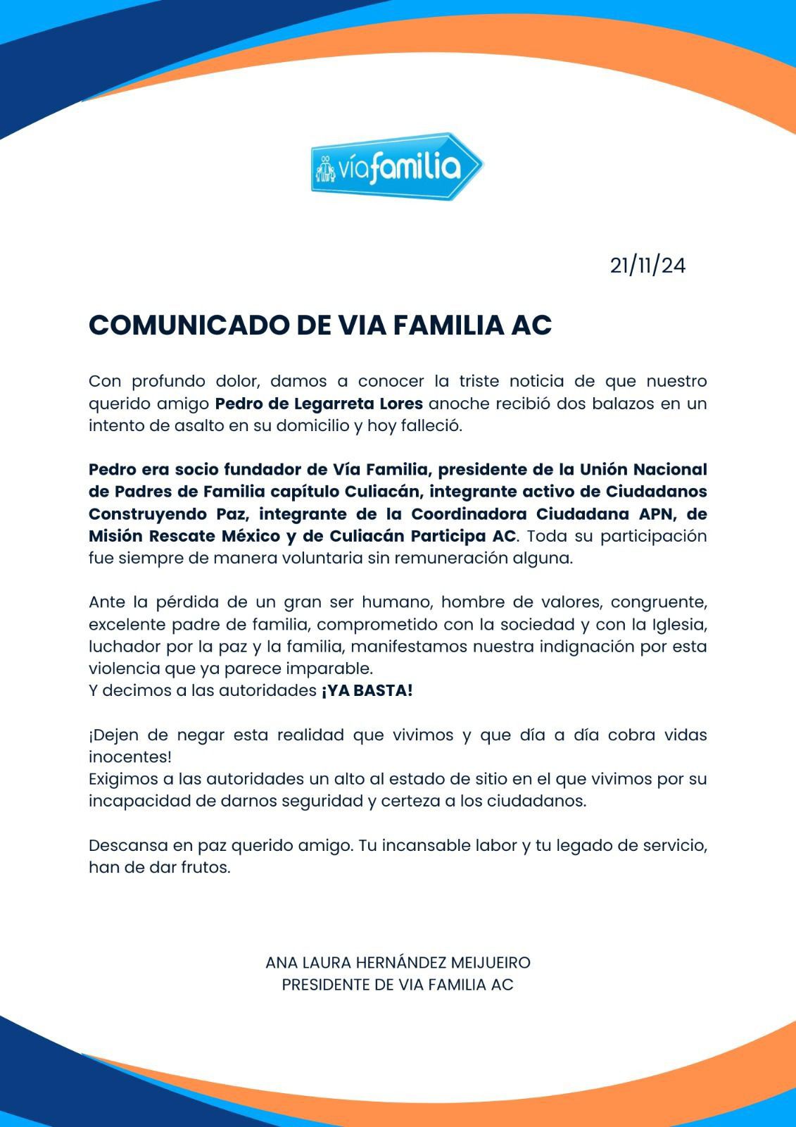 Reiteró que, al igual que Pedro de Legarreta, muchos sinaloenses han sido víctimas de este tipo de delitos, y exhortó a las autoridades a atender esta problemática para evitar que más personas inocentes pierdan la vida.