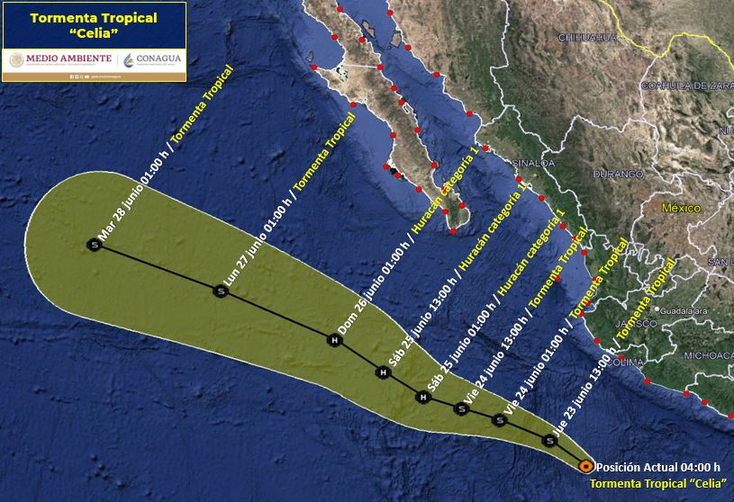 La tormenta tropical “Celia” continuará intensificándose al suroeste de las costas de Colima. Su circulación favorecerá abundante ingreso de humedad que interaccionará con el avance de la onda tropical número 6 sobre Guerrero y con un canal de baja presión en la Mesa del Norte y la Mesa Central, lo que originará temporal de lluvias puntuales fuertes a muy fuertes en el occidente, centro y sur de México, con lluvias puntuales intensas que podrían generar deslaves e inundaciones en Nayarit y Jalisco.