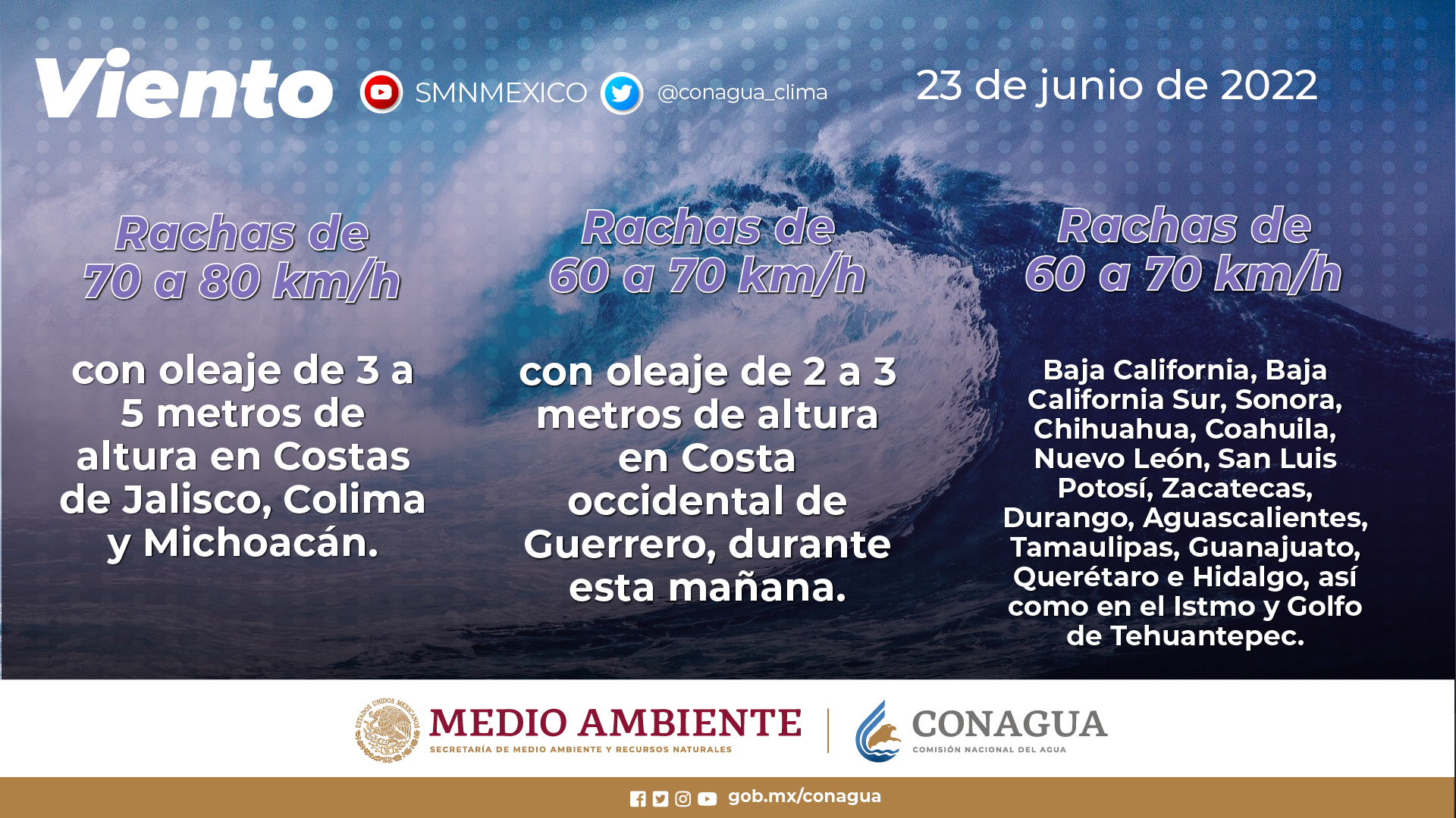 Asimismo se percibirán rachas de viento de 60 a 70 km/h y oleaje de 2 a 3 metros de altura en costas de Colima, Guerrero y Michoacán, además de viento con rachas de 50 a 60 km/h y oleaje de 1 a 2 metros de altura en costas de Oaxaca y Jalisco.