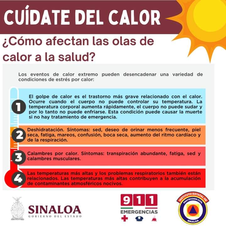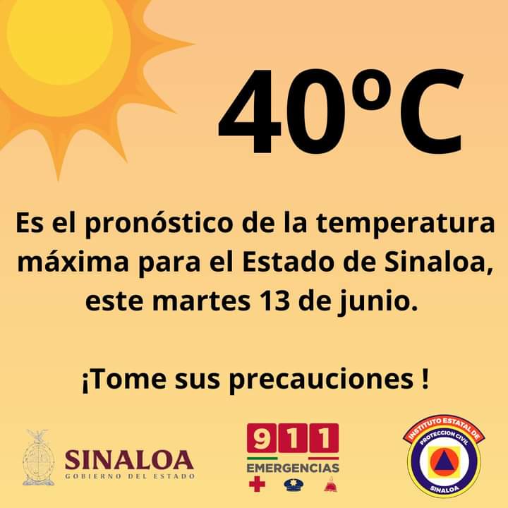 En sintonía con la política estatal de prevención ante riesgos naturales instruida por el Gobernador Rubén Rocha Moya, el Instituto Estatal de Protección Civil de Sinaloa que dirige Aurelio Roy Navarrete Cuevas, solicita a la población sinaloense tomar medidas para evitar golpes de calor, ante las altas temperaturas que de acuerdo al más reciente reporte efectuado por el Servicio Metereológico Nacional, pronostica temperaturas máximas de entre 40 y 45 grados centígrados en el Estado de Sinaloa.