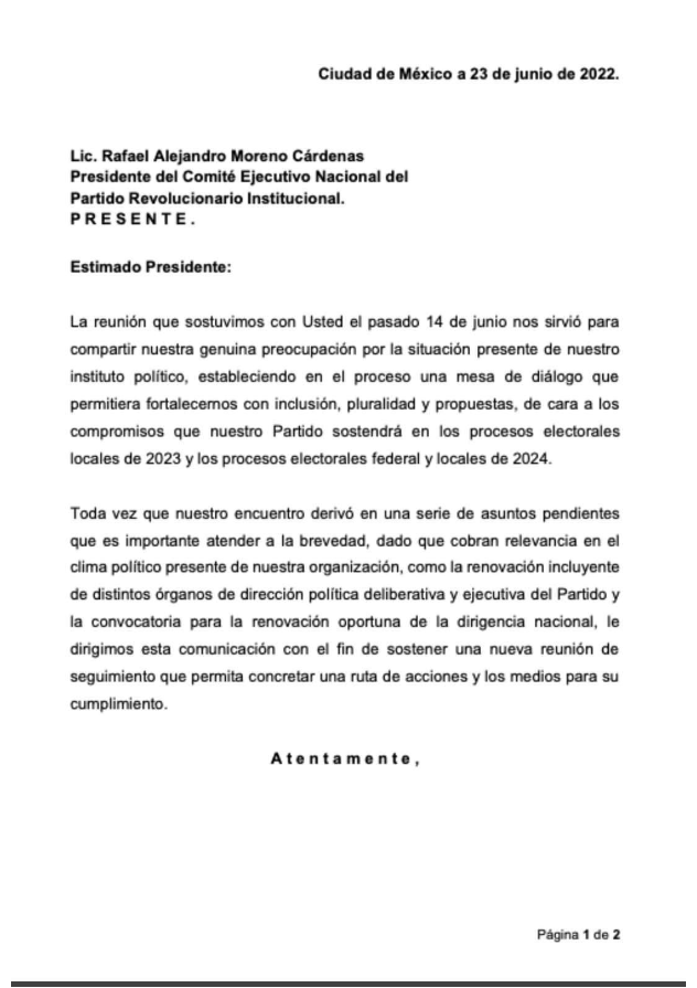 “Toda vez que nuestro encuentro derivó en una serie de asuntos pendientes que es importante atender a la brevedad dado que cobran relevancia por el clima político presente de nuestra organización, como la renovación incluyente de distintos órganos de dirección política deliberativa y ejecutiva del Partido y la convocatoria para la renovación oportuna de la dirigencia nacional, le dirigimos esta comunicación con el fin de sostener una nueva reunión de seguimiento que permita concretar una ruta de acciones y los medios para su cumplimiento”, se lee en el escrito.