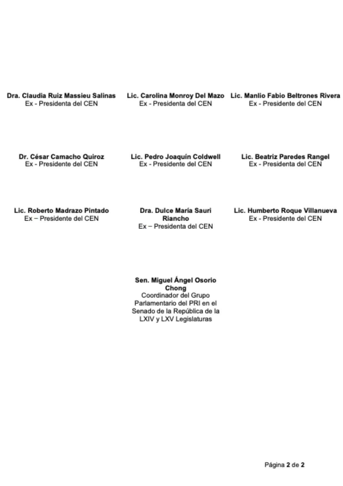 La misiva se encuentra firmada por los expresidentes del PRI Claudia Ruiz Massieu Salinas, Carolina Monroy del Mazo, Manlio Fabio Beltrones Rivera, César Camacho Quiroz, Pedro Joaquín Coldwell, Beatriz Paredes Rangel, Roberto Madrazo, Dulce María Sauri, Humberto Roque Villanueva, así como el coordinador del Grupo Parlamentario del PRI en el Senado, Miguel Ángel Osorio Chong.