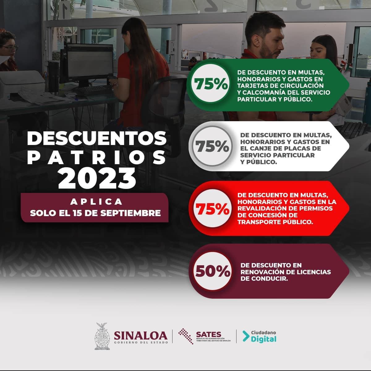 El Gobernador del Estado, Dr. Rubén Rocha Moya buscando el bienestar de las familias Sinaloenses, autoriza paquete de ”Descuentos Patrios 2023”, solicitado por el Director General del SATES, Lic. Ismael Bello Esquivel, que se llevará a cabo el día 15 de septiembre de 2023, con un horario de atención de 8 am a 3 pm.