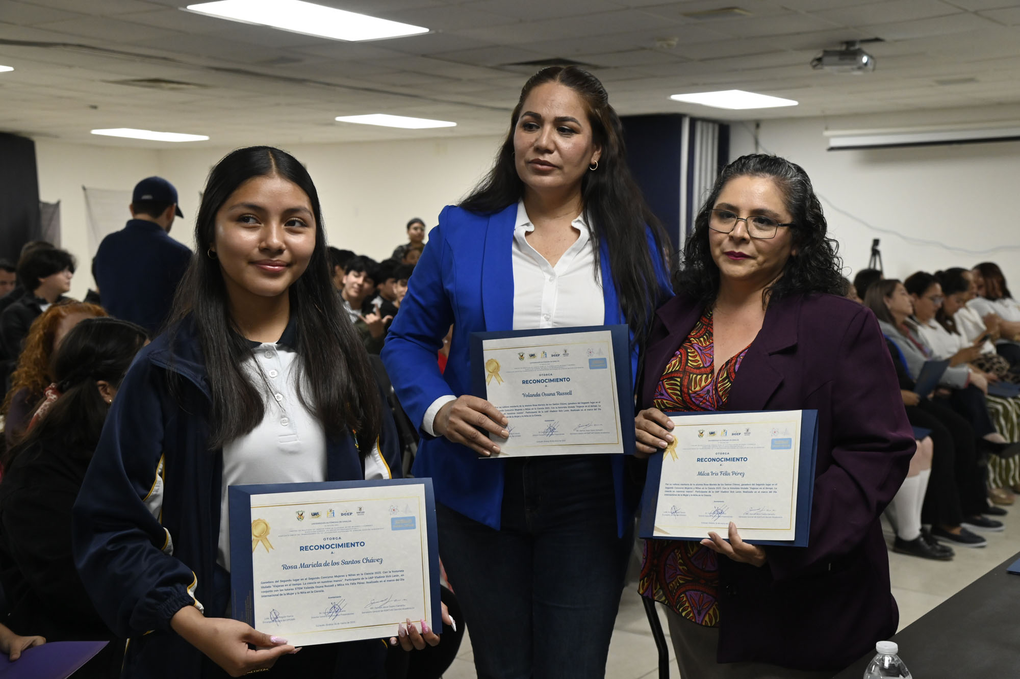 Se trata de Mayte Caro Escatel, alumna de la preparatoria Dr. Jorge Fausto Medina Viedas; Allison Itzayana Cano Camarena de la Emiliano Zapata y Naomi Guadalupe Contreras Chairez también de la Medina Viedas quienes ganaron el primero, segundo y tercer lugar de la modalidad de Cartel, con “Ciencia sin límite igualdad son frontera. Mujeres y Niñas en la Ciencia: Rompiendo barreras, creando futuro”; “Mirando al cielo, pensando en grande” y “11 de febrero, Día Internacional de la Mujer y la Niña en la Ciencia”, respectivamente.