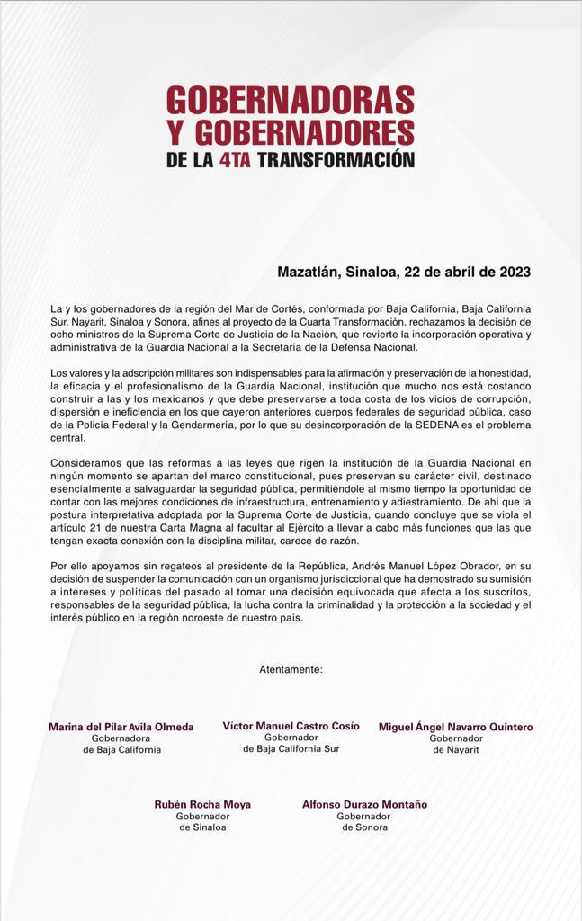 En el marco de la Quinta Reunión Regional de Gobernadores para la Coordinación de Seguridad de la Región del Mar de Cortés, a la cual también asistió el secretario de Gobernación, Adán Augusto López Hernández, el gobernador Rubén Rocha Moya ponderó la participación de la Guardia Nacional en las tareas de coordinación y apoyo en materia de seguridad pública, por su disciplina y constancia, externó lo que llamó su aspiración y deseo de que esta institución pueda seguirse manteniendo al mando de la Secretaría de la Defensa Nacional.