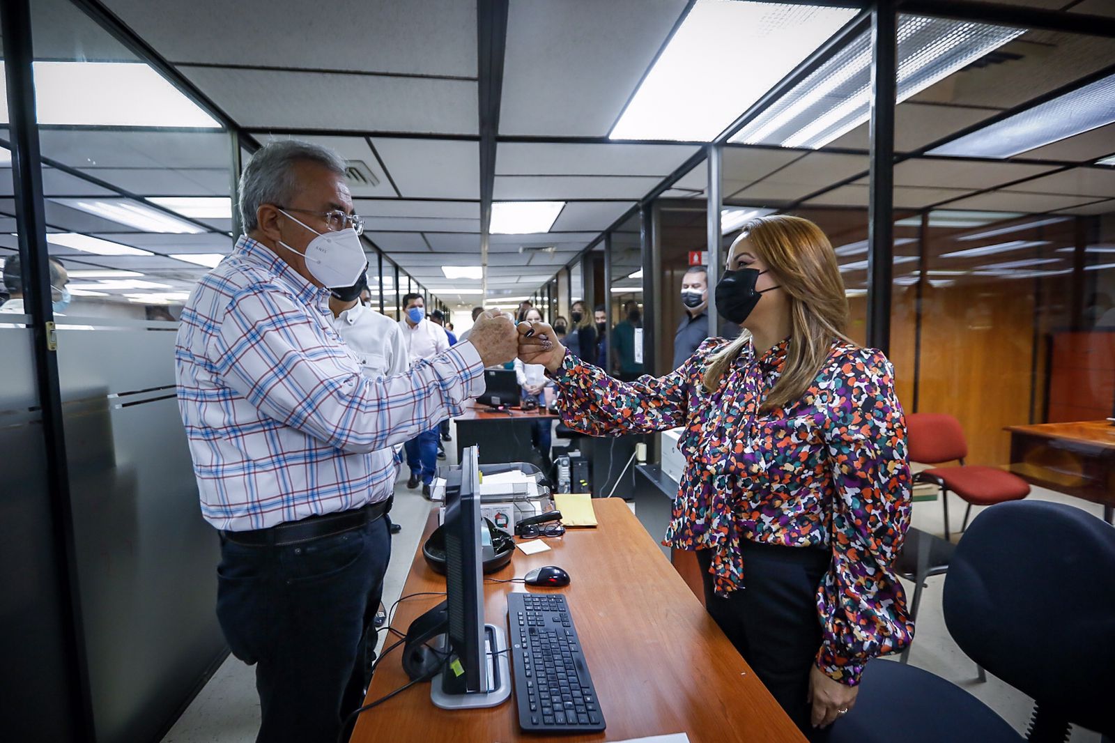 La primera oficina que visitó fue el SATES, tomando por sorpresa a los trabajadores e incluso al propio titular, Oscar Luis López Barraza, quien lo recibió gustoso y lo acompañó por entre los escritorios, y el gobernador saludó de mano a todos los empleados y les preguntaba su nombre, cuál era su función y cuántos años tenían trabajando, e incluso se topó con bastantes caras conocidas.