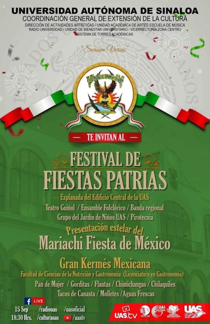 El Rector de la Universidad Autónoma de Sinaloa (UAS), doctor Jesús Madueña Molina, invita a la comunidad universitaria y a la sociedad en general a disfrutar del Festival de Fiestas Patrias que se realizará este jueves 15 de septiembre en la explanada del Edificio Central con motivo de la Celebración del 212 Aniversario del Grito de Independencia.