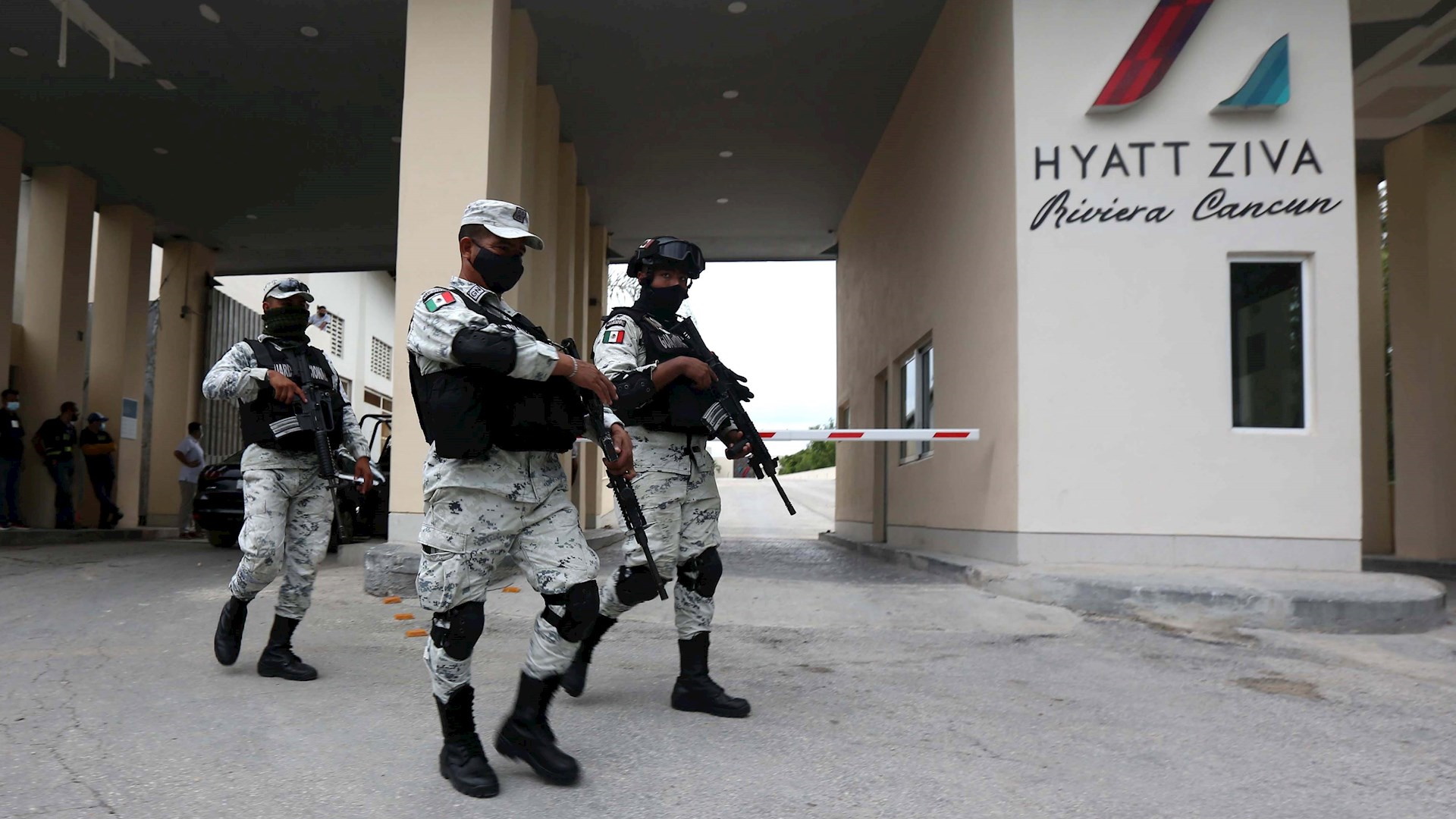 De manera poco usual, ya que no es común que participe en estos operativos, un helicóptero de la Armada de México se unió a las labores de vigilancia de todo el perímetro de este complejo hotelero al que solo se llega fácilmente por la carretera principal, pues su playa está rodeada de manglar.