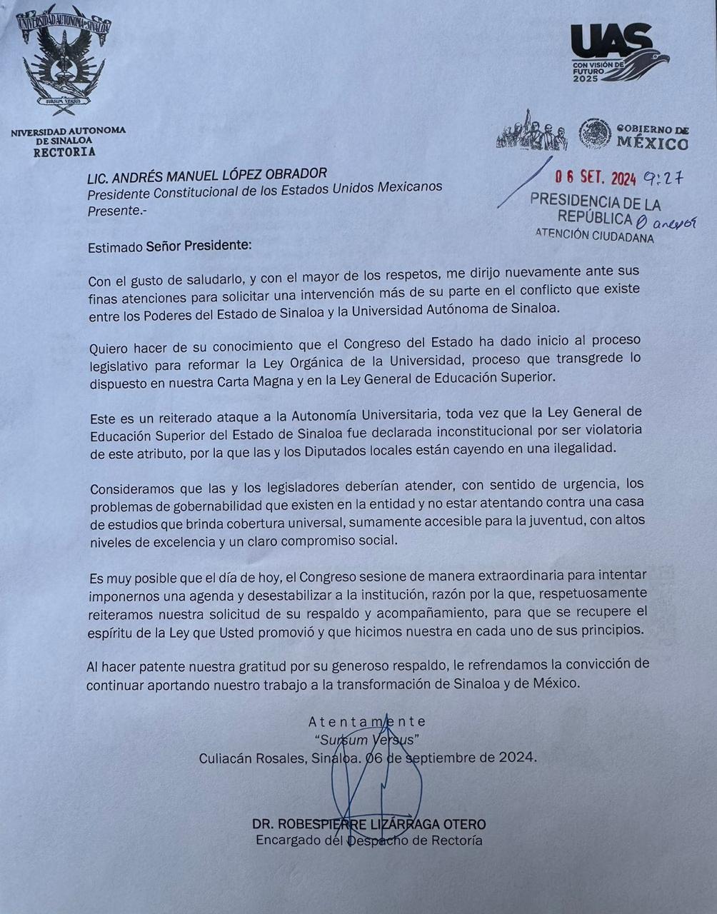 Robespierre Lizárraga denuncia ante AMLO el atropello y la vulneración a la autonomía de la UAS por parte del Congreso del Estado y solicita una vez más su intervención en el conflicto