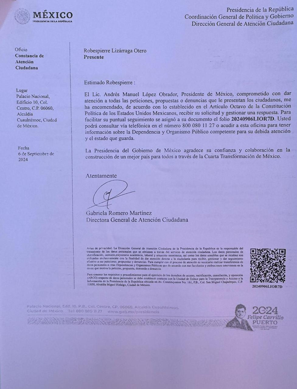 En las instalaciones de Palacio Nacional Lizárraga Otero entregó un documento al personal de la oficina de Atención Ciudadana de la Presidencia de la República, para poner en conocimiento del presidente lo que el Congreso Local ha estado anunciando.