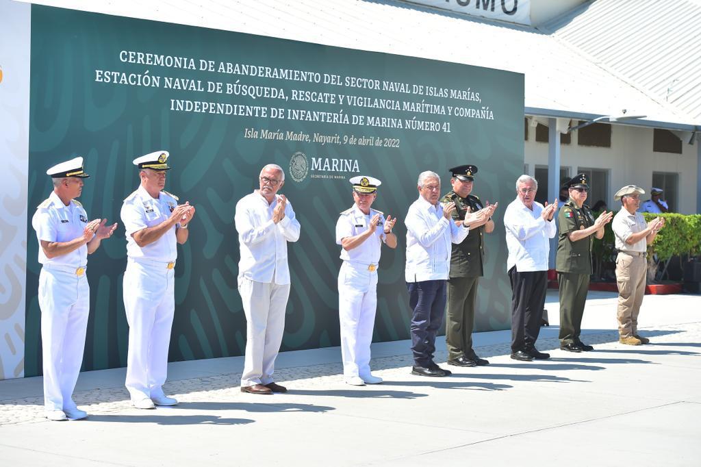 El mandatario estatal acudió junto con el presidente López Obrador y autoridades de la Secretaría de Marina y la Defensa Nacional, a la ceremonia de abanderamiento del sector Naval de Islas Marías, la estación Naval de búsqueda, rescate y vigilancia marítima y de la compañía independiente de Infantería de Marina número 41, evento realizado en la base del sector Naval en la Isla María Madre.